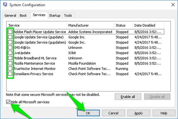 - وارد تب Services شوید و تیک گزینهی « Hide all Microsoft services » را بردارید تا بتوانید همهی سرویسهایی که به همراه ویندوز بالا میآیند را ببینید.
