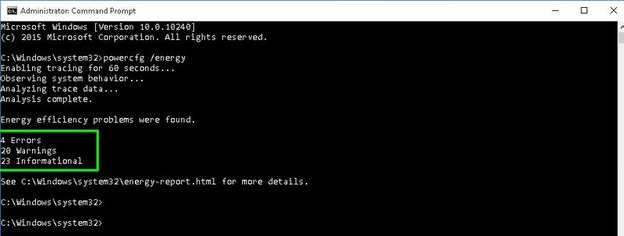 - در اینجا کد دستوری powercfg /energy را وارد کرده و تایید بزنید. این دستور مصرفِ 60 ثانیهی کامپیوترتان را بررسی میکند. شما میتوانید در این بازه هرکاری که میخواهید انجام دهید.