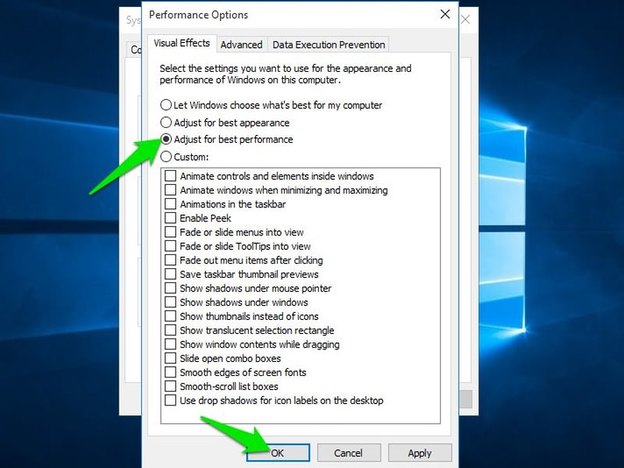 - حال عبارت «Adjust for best performance option» را انتخاب کنید و تایید بزنید تا همهی تصاویر متحرک و سایههای ویندوز غیرفعال شوند.
