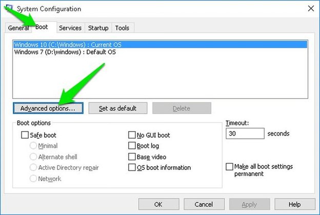 - حال به تب Boot بروید و بر روی Advanced option کلیک کنید در حالی که سیستم عامل مورد نظرتان انتخاب شده است.