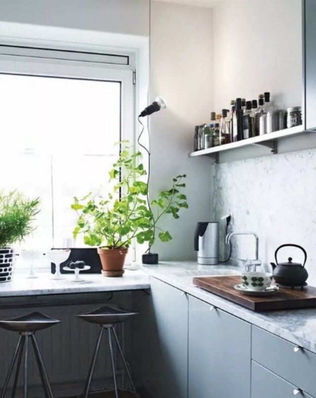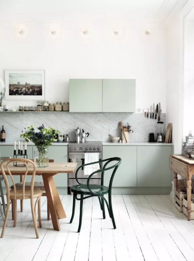 در این آشپزخانه زیبا می بینیم که رنگ های کم رنگ چگونه در کنار هم قرار گرفته و هماهنگ شده اند. خاکستری کم رنگ به خودی خود زیباست اما در کنار صندلی های نعنایی و رنگ سفید، فضایی زیبا و بهاری به وجود آورده است.