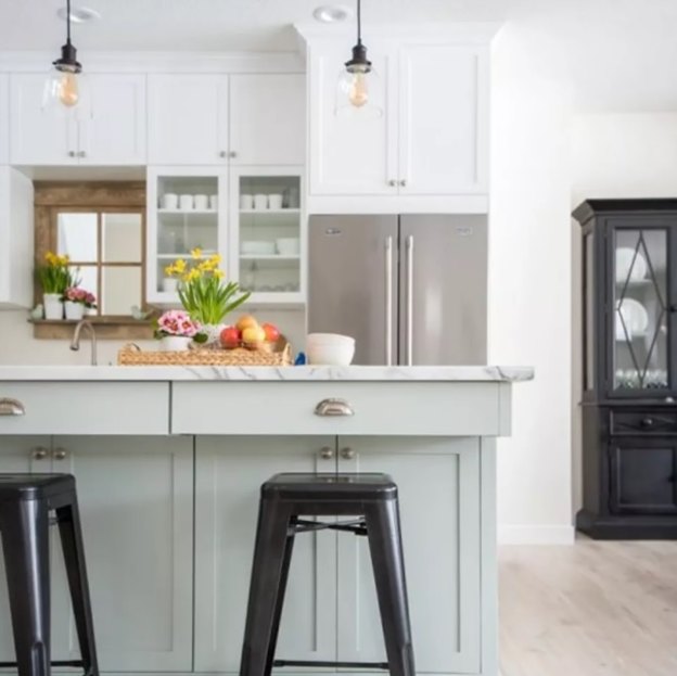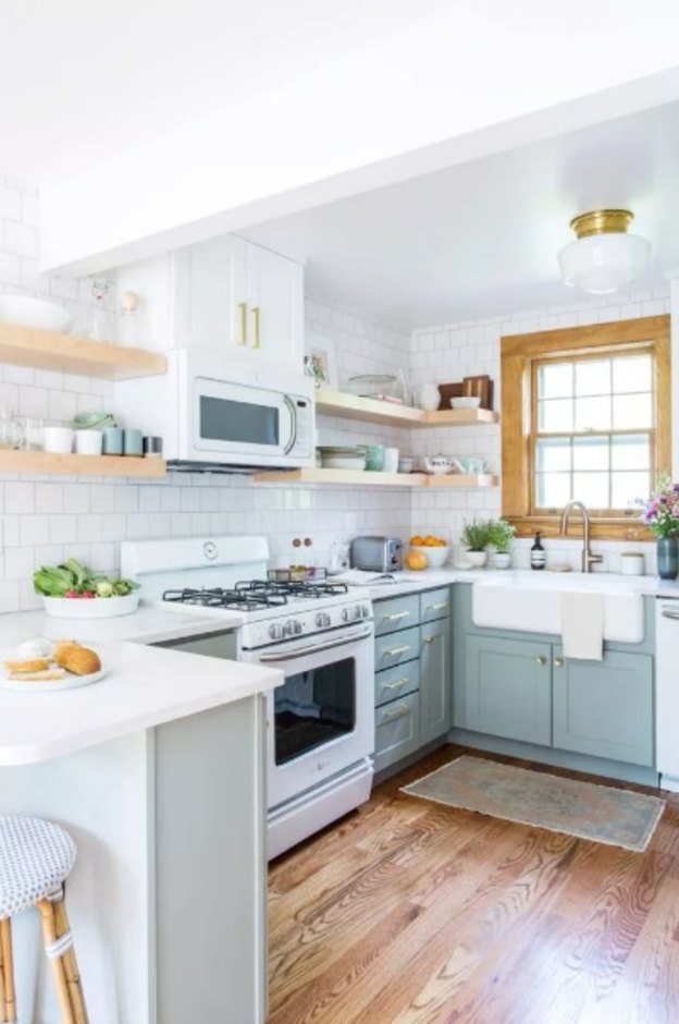 اگر کابینت هایتان بلند نیستند، احتمالا قسمت های بالای کابینت به رنگ آمیزی نیاز دارند. در این آشپزخانه دیوار بالای کابینت های سفید به رنگ آبی کم رنگ تبدیل شده تا هماهنگی و جلوه زیبا و جذابی پدید بیاید.