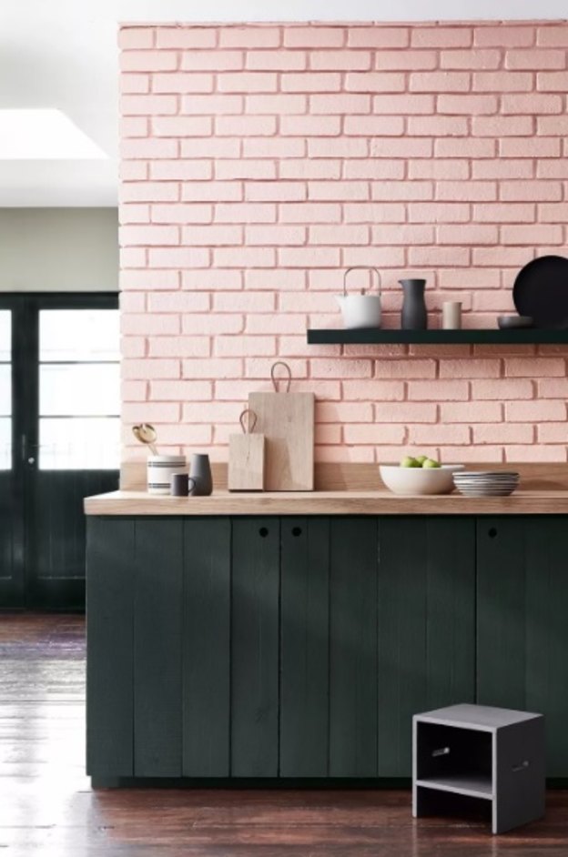 اگرچه طرح سیاه و سفید یک طرح کلاسیک است اما در این طرح به شکل جالب و جدیدی خلق شده است. کابینت های مشکی زیرین بسیار کلاسیک بوده و دیوارهای آجری صورتی از تیره شدن فضا اجتناب می کند.