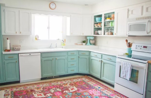 افزودن رنگ سبز نعنایی به کابینت های آشپزخانه می تواند نمای زیبایی پدید آورد. با رنگ کردن کابینت های پایین، نه تنها آشپزخانه زنانه یا کودکانه نمی شود، بلکه ظاهر مدرنی به دست می آورد. با قرار دادن یک فرش رنگی جذابیت آشپزخانه تان دوچندان می شود.