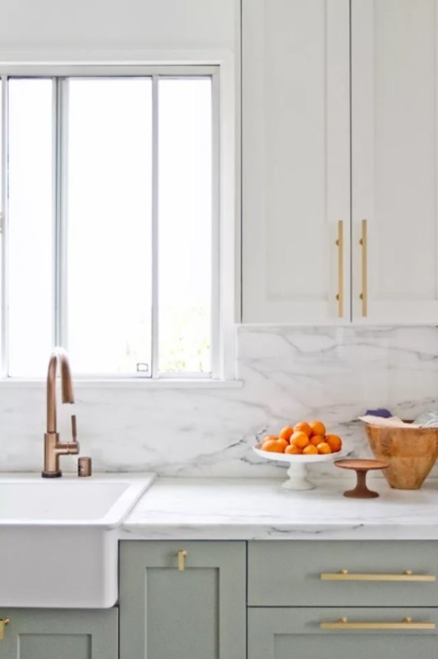 افزودن مرمر در هر کجای خانه زیباست اما در آشپزخانه بهترین ایده می باشد. در اینجا آشپزخانه مرمر در کنار رنگ طلایی به کار رفته است. کابینت های سبز چرک در پایین هماهنگی بسیار خوبی به وجود آورده و به آشپزخانه جلوه زیبایی بخشیده است.