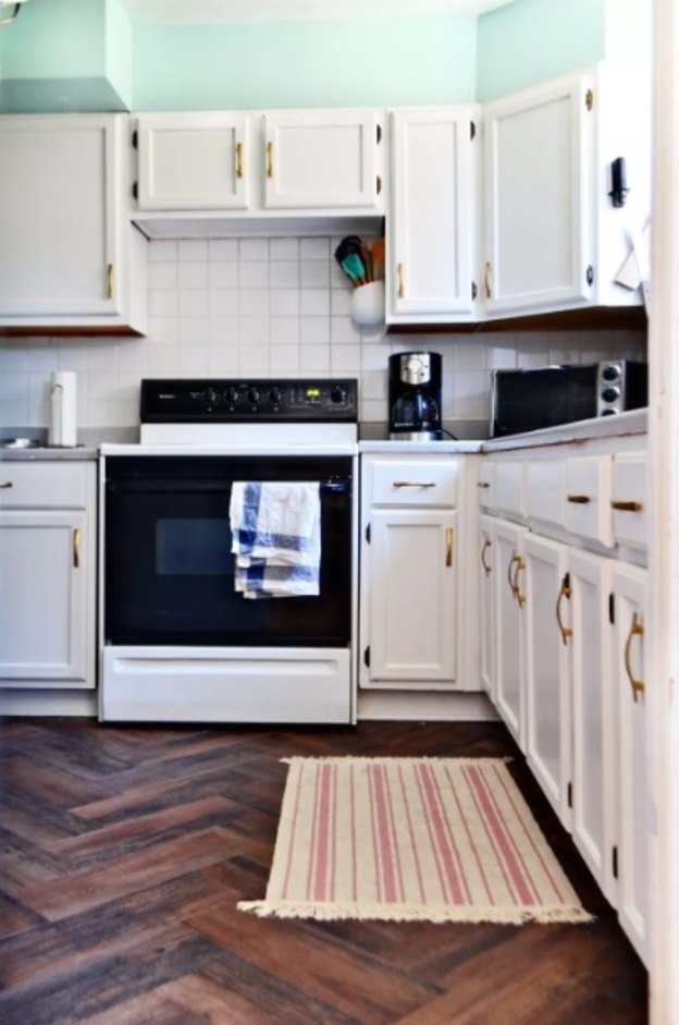 این آشپزخانه نه تنها کابینت های نعنایی زیبایی دارد، بلکه کابینت های بادامی در کنار رنگ روشن زیبایی این فضا را صد چندان کرده است. رنگ کردن کف آشپزخانه یکی از بهترین ایده ها برای افزایش هماهنگی محیط است که بدون متخصص انجام می شود. اگر می خواهید طرح های مختلف به وجود آورید بهتر است از رنگ روشن استفاده کنید.