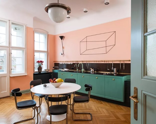 یکی از ایده های جالب طراحی آشپزخانه این است که از چند رنگ پررنگ و جذاب در کنار هم استفاده کنید. در اینجا رنگ های صورتی و سبز، که شاید متضاد به نظر برسند، جلوه زیبایی پدید آورده اند. صورتی کم رنگ در کنار سبز بیشتر به چشم می آید و کاملا آرامش بخش است.
